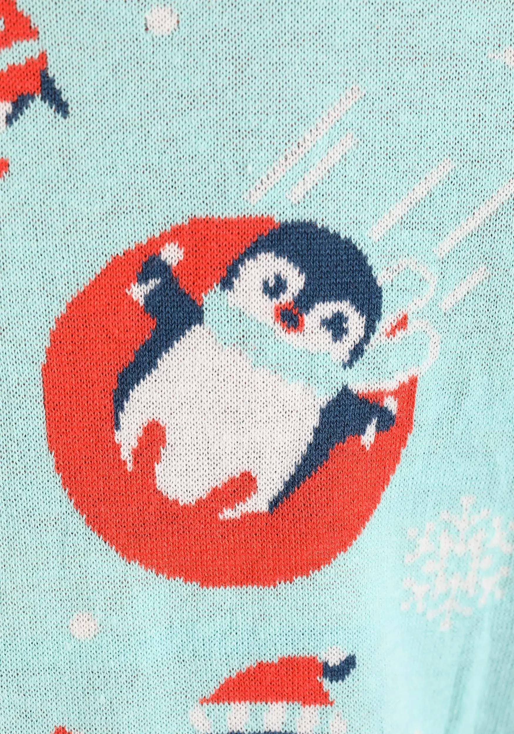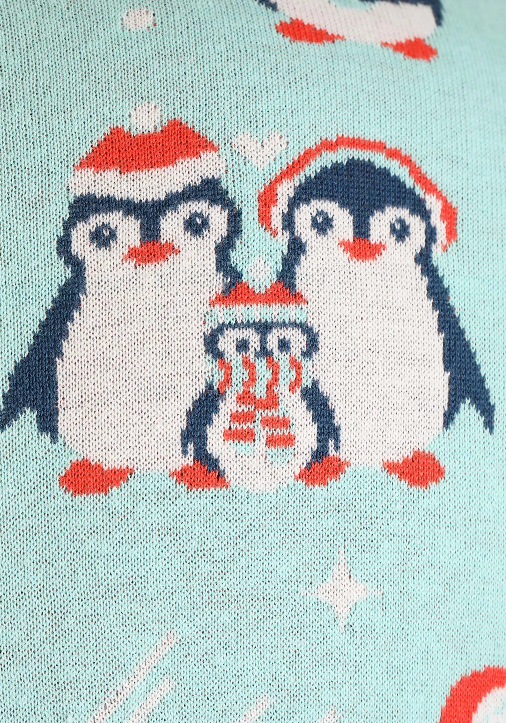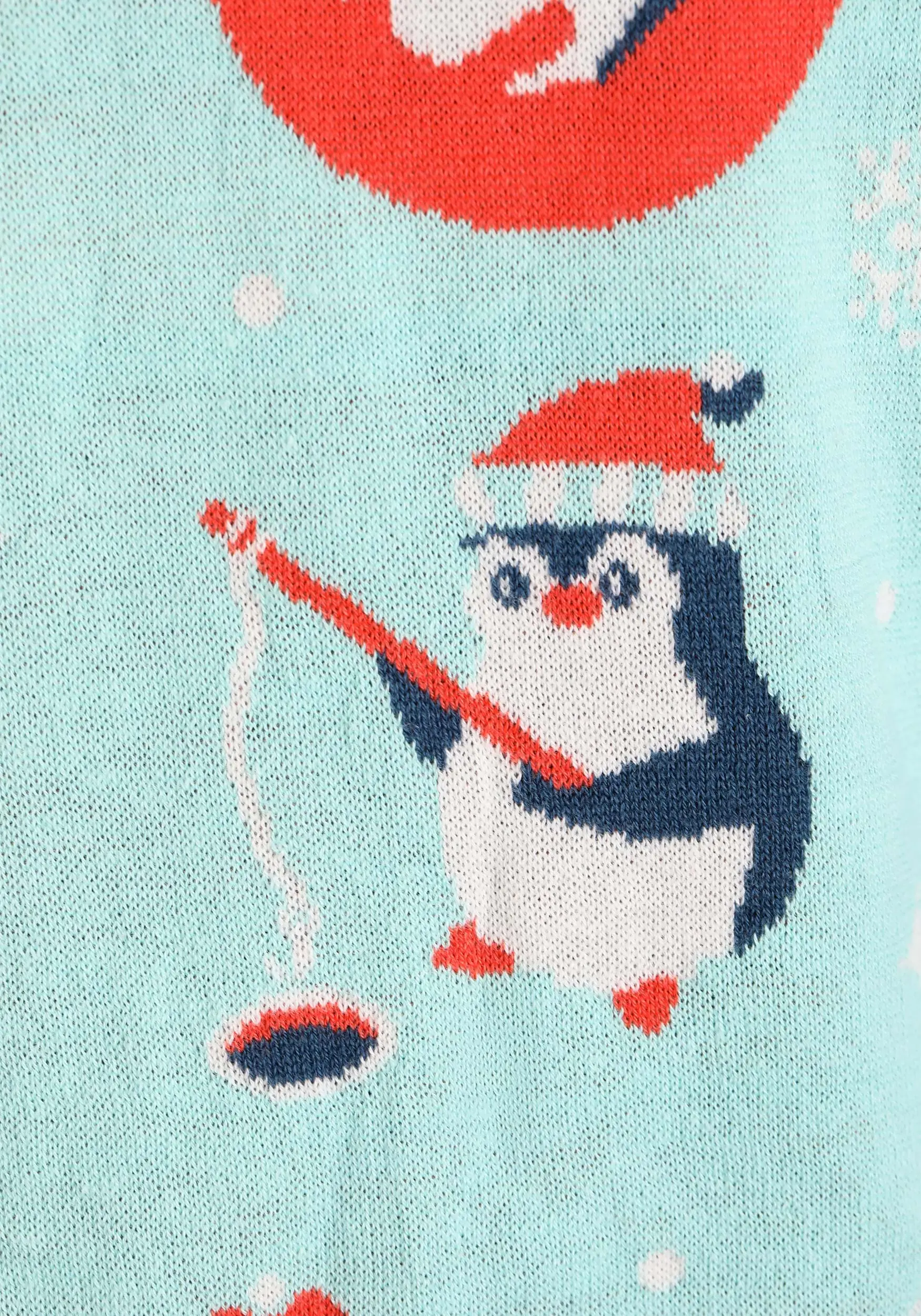 - Soft sweater has images of penguins
