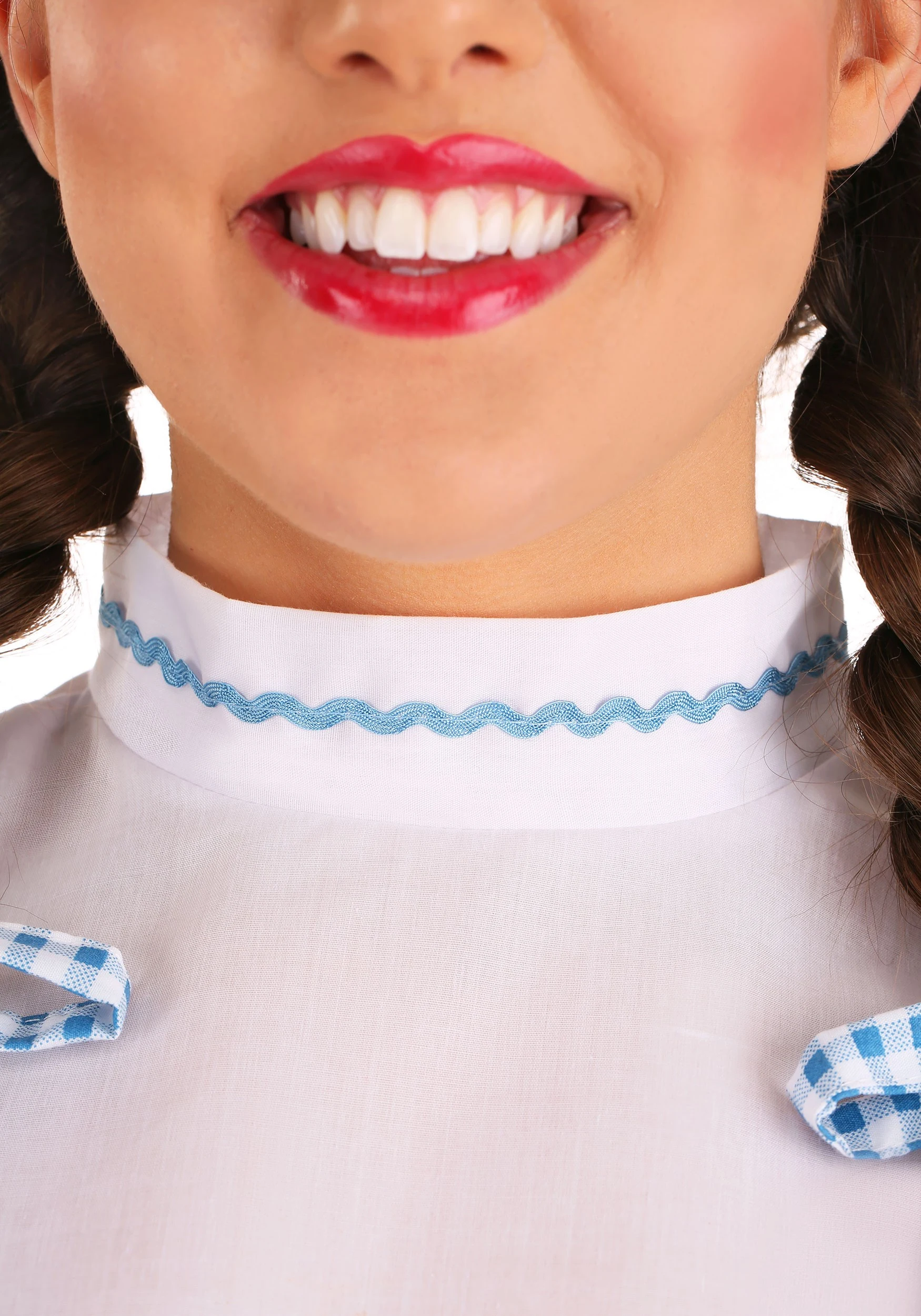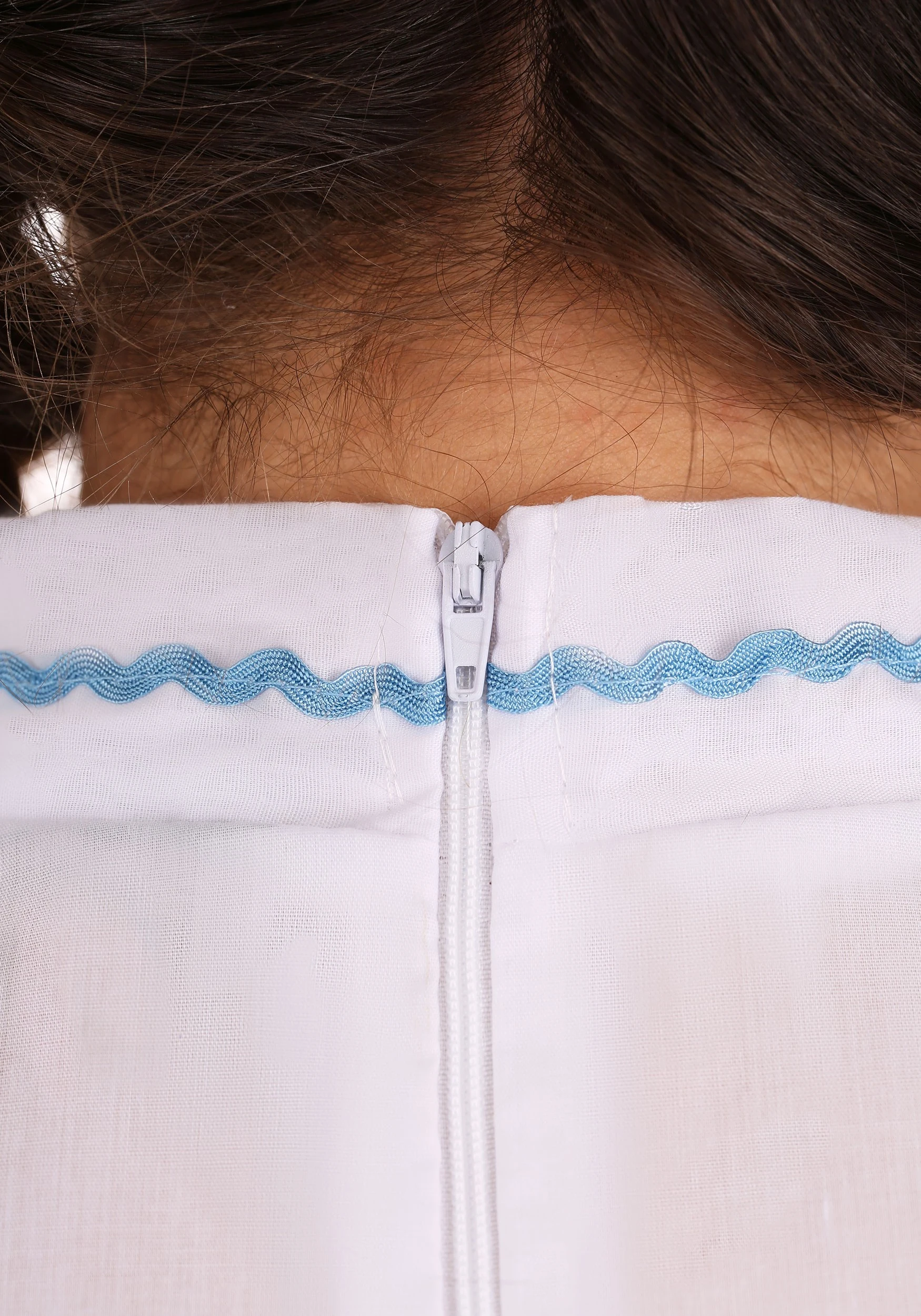 - White blouse has gingham trim on collar & sleeve cuffs, hook and loop closure at back