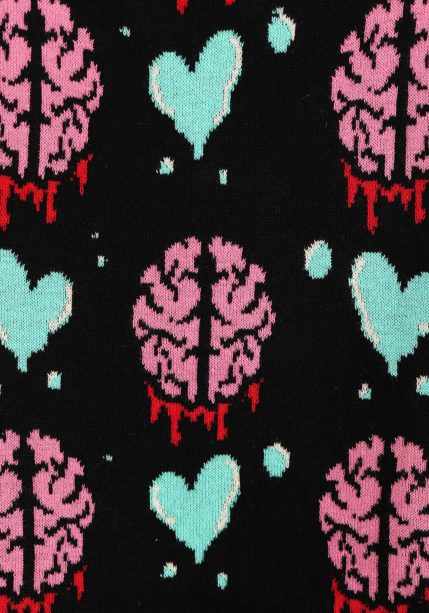 Like you find yourself at a loss for words, zombies canโt express them. But they fall to pieces for the things they really want! Capture the truth of your undying love for that special someone with our exclusive Youโre My Zom-Bae Valentineโs Day Sweater. The Made By Us knit-sweater depicts a pair of decaying zombie hands forming a heart meant to tell your loved one theyโre your Zom-Baeโyouโll love them long after death. And with its black and pastel color palette breathing life into a heart and brain all-over-print, this one-of-a-kind pullover is the creepy-cute answer to your expressionless love!
