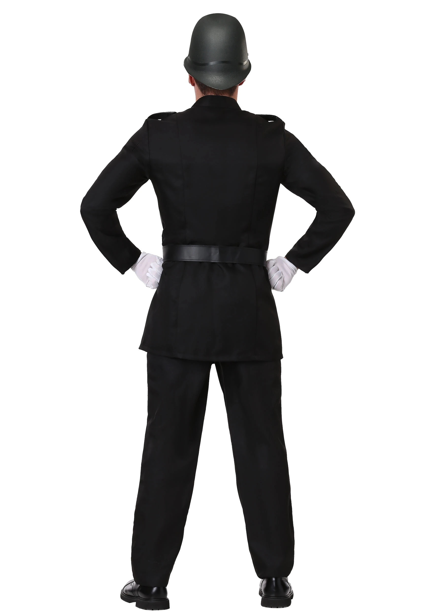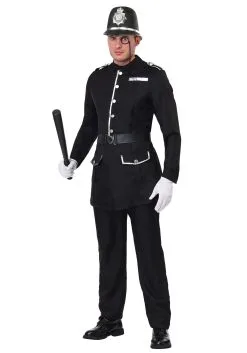 Dispense justice in style thanks to your exclusive British Bobby Costume for Men! The long black jacket buttons up the center front and features two functional flap pockets as well as a false breast pocket, all trimmed with silver braid. Each shoulder is decorated with a silver-tone epaulet. The matching pants have an elastic waistband to keep you comfortable while you’re running after bad guys. A metal clasp secures the faux leather belt around your waist. A clear vinyl monocle ties around your head, and the molded plastic helmet hides the monocle’s cord.
