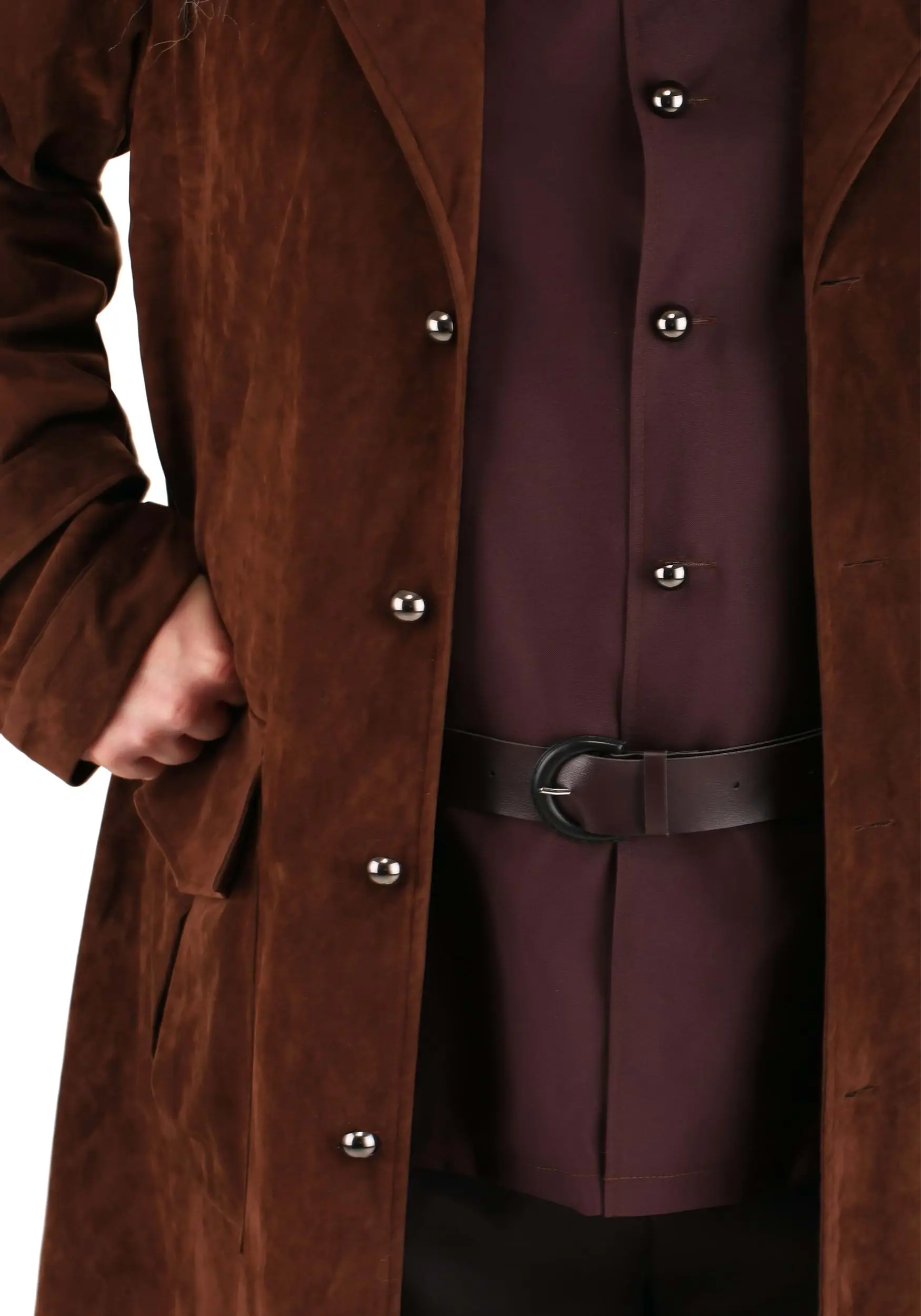 - Faux leather belt sewn into side seams of jacket has plastic buckle