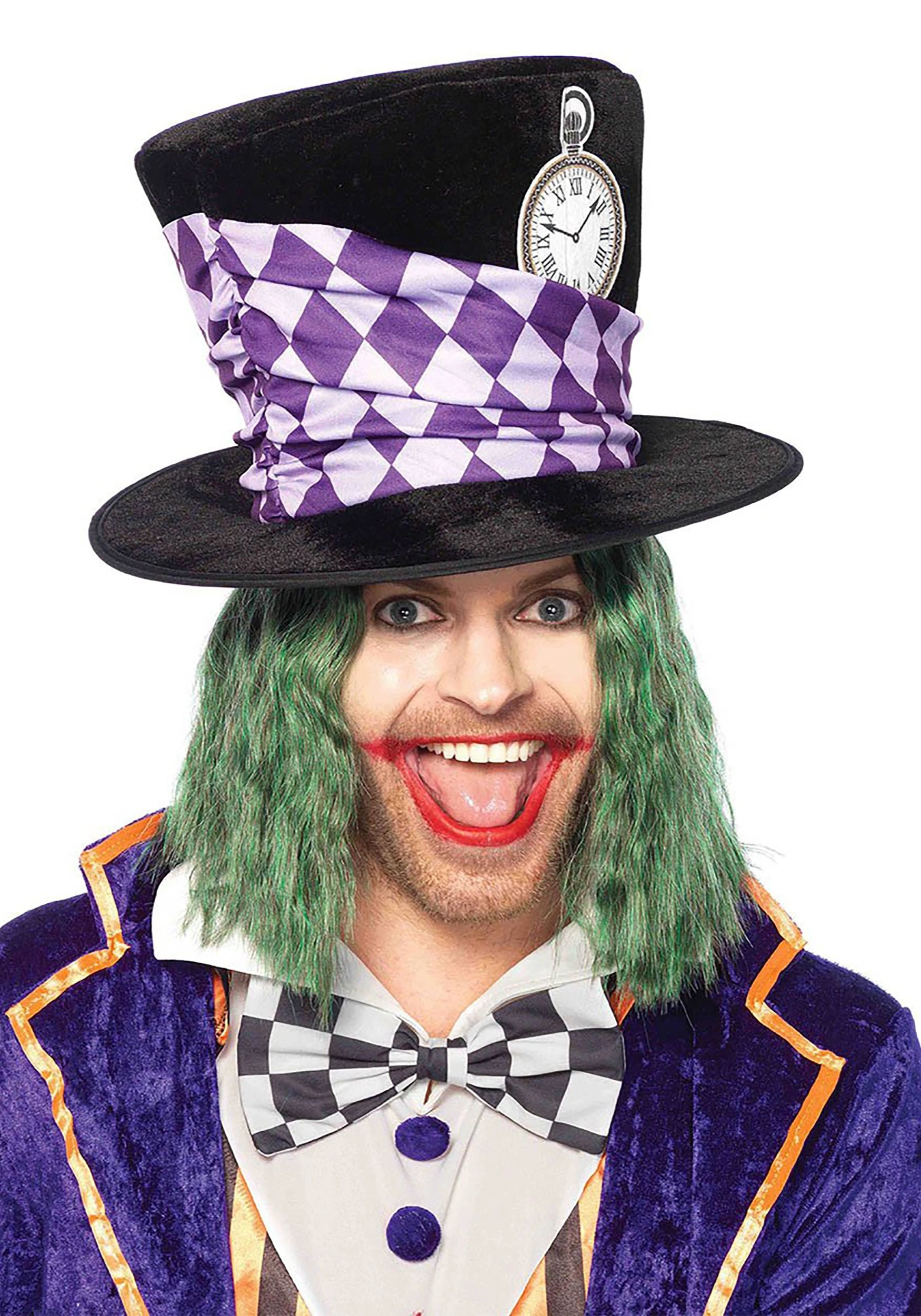 Here’s a question. What, exactly, was in the Mad Hatter’s tea? This wild hat might give you the Mad Hatter mindset and perhaps you’ll find out! The huge velvet top hat is trimmed with a purple diamond pattern and a ruched side. The top has an icon with the frozen pocket watch attached to complete this whimsical look!