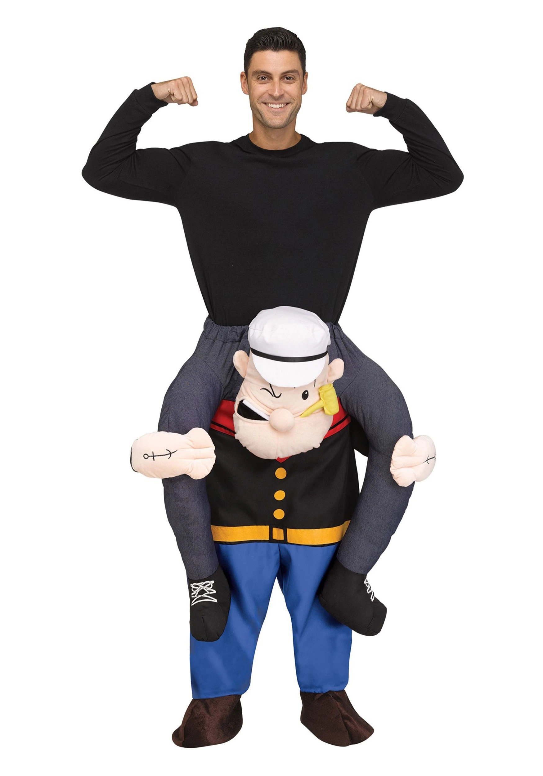 This clever costume will help you bulk up your costume game, instantly! It’s a trick of the eye, but your legs will reach all the way to the floor in this ensemble (we’re sorry you actually do have to walk), but they’re covered and styled to look like Popeye’s! It will appear as though you’re getting a sweet piggyback ride from the strongman sailor himself. Not only that, but Popeye’s plush face is twisted into a cringe, so it looks like he’s working really, really hard to haul you around!