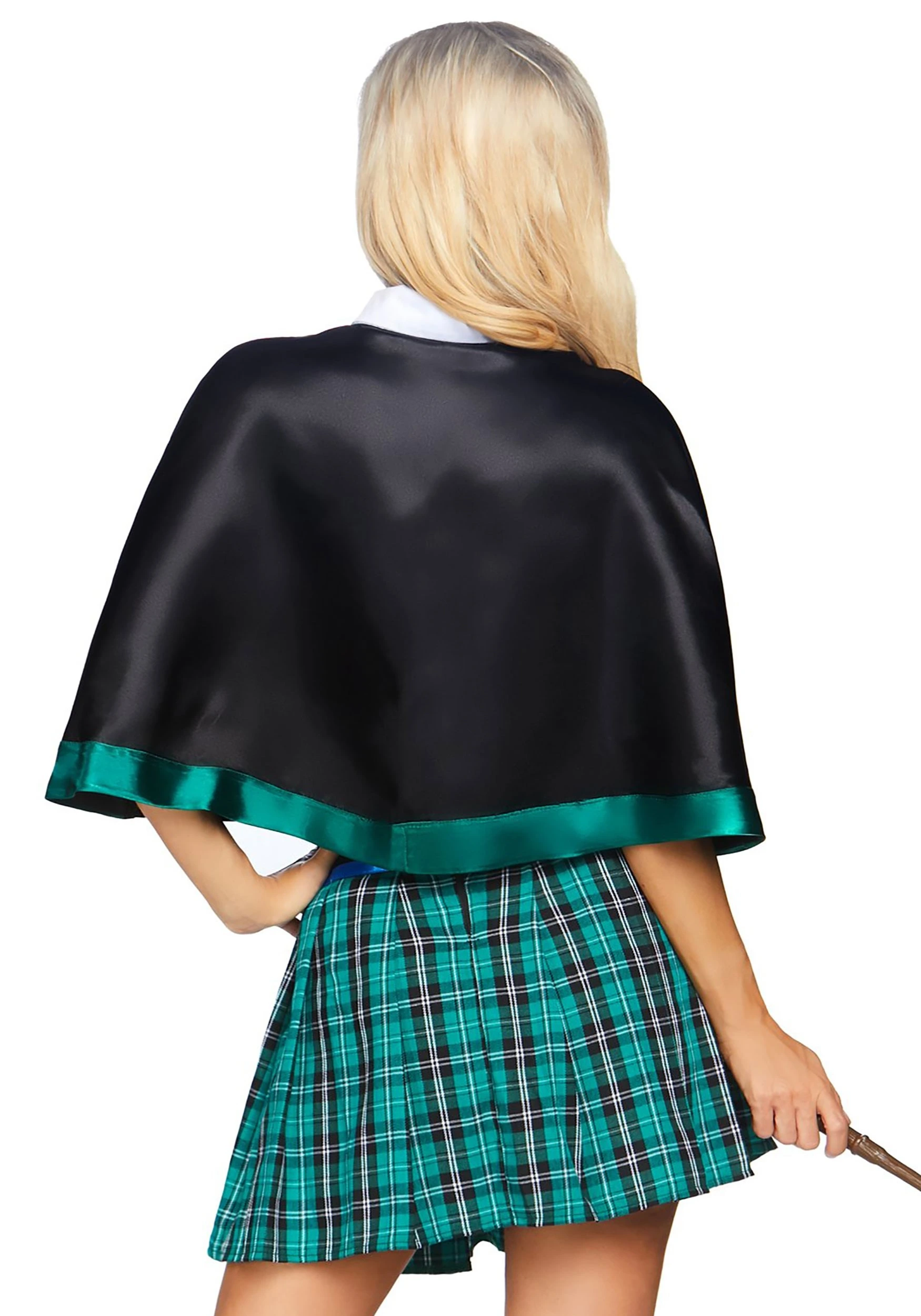 The first step is stepping into this Women’s Sinister Spellcaster Costume. Whether you intend to unleash wicked magic or save the world with your magical might, having a startling style is critical! Fortunately, with this skirt and crop top combo, you’ll be doing just that. The skirt is green plaid and features a shiny black and blue belt at the waist. The crop top bares your belly and features a deep cut that really shows off the white collar and green striped tie! Still, that might not be enough to really show that you have the mark of a magician. That’s why we’ve included the shiny green short cape. It fastens under the collar and provides a fun way to flirt with danger.
